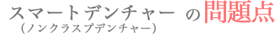 スマートデンチャー(ノンクラスプデンチャー)も例外ではなく、歯肉色をしたプラスティックの留め金を必要とします。この留め金は、強度を得るために、金属製の留め金の倍以上の太さと厚みを必要とします。ですから、スマートデンチャー(ノンクラスプデンチャー)の留め金のかかっている歯は、不自然に肉が盛り上がり、周りの歯がより短く見えてしまうことになります。